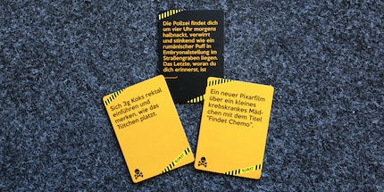 Place the cards face down on the table, separated by colour. You can do this. All players always have eight cards in their hand at the start of each round: three black cards (cloze cards) and five orange cards (cloze cards).