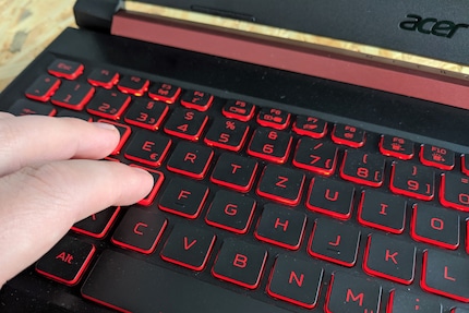 Die ganze Zeit haben mir dagegen die Tasten gefallen. Sie sind ausreichend groß und haben vernünftige Abstände zueinander. Ihr Hub ist mit 1,6 Millimetern angenehm hoch und die Druckpunkte klar und deutlich. Da gibt es bei der Spielsteuerung keine Zweifel. Bei Dunkelheit sorgt die rote Hintergrundbeleuchtung dafür, dass du die Tasten besser erkennst. Damit dir die WASD-Tasten und die Pfeiltasten direkt auffallen, hat Acer sie optisch hervorgehoben.