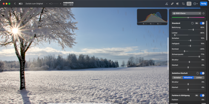 Bei der Bearbeitung sieht es besser aus als bei der Verwaltung. Zwar hat auch hier Lightroom die Nase vorn, aber Photomator bietet angesichts des niedrigen Preises erstaunlich viel. Die wichtigsten Funktionen sind alle drin, dazu kommen auch einige fortgeschrittene Features wie automatische Himmelerkennung oder Entrauschen und Hochskalieren auf KI-Basis. Die Geschwindigkeit ist ebenfalls erfreulich. Während die Bildverwaltung bei gewissen Vorgängen schnarchlangsam ist, geht die Bearbeitung flink. Die KI-Entrauschung etwa ist deutlich schneller als in Lightroom. Zudem kann Photomator ein Foto gleichzeitig entrauschen und hochskalieren, während in Lightroom nach wie vor nur das eine oder das andere möglich ist.