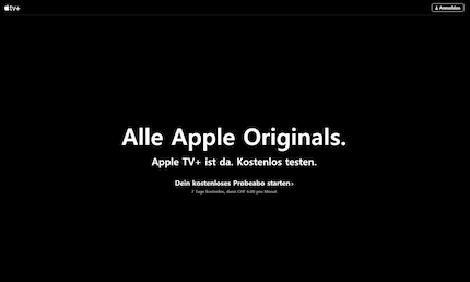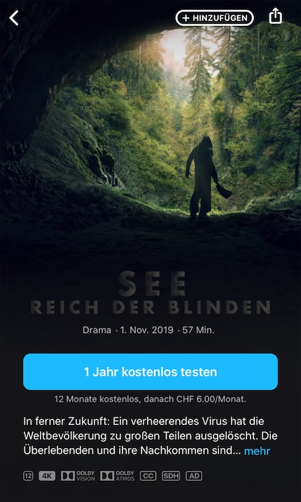 Achtung: Wer ein neues Apple-Gerät gekauft hat, kriegt Apple TV Plus ein ganzes Jahr lang gratis. Qualifiziert sind alle neuen iPhone-, iPad-, iPod touch-, Apple TV- oder Mac-Geräte mit den neuesten iOS-, iPadOS-, tvOS- oder macOS-Versionen, die nach dem 10. September 2019 gekauft worden sind.