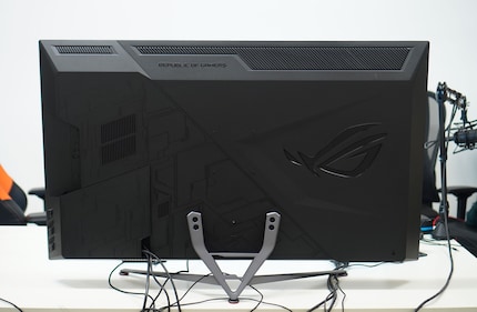 Mit seinen fast 23 Kilogramm und einer Dicke von 7,5 Zentimetern ist der Asus XG438Q kein Leichtgewicht. Der Standfuss nimmt hinter dem Monitor noch mal rund 15 Zentimeter in Anspruch, womit das Display nie weniger als rund 23 Zentimeter vom Tischende weg sein kann.