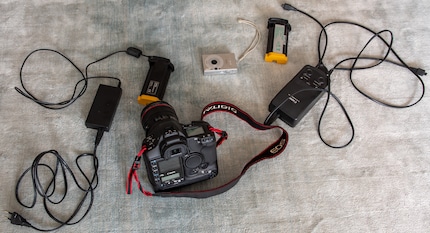 Dieses Ungetüm von einer Kamera wiegt eineinhalb Kilo – ohne Objektiv. Mit dabei sind zwei riesige Akkus plus ein Gleichstromkuppler, der wie ein weiterer Akku aussieht, aber keiner ist. Er hängt am anderen Ende an einem Netzstromadapter und versorgt so die Kamera dauerhaft mit Strom. Das Ladegerät kann beide Akkus gleichzeitig aufladen und erinnert mit seinen Armen an eine Riesenkrake. Jedes einzelne dieser Teile ist grösser als eine Kompaktkamera.