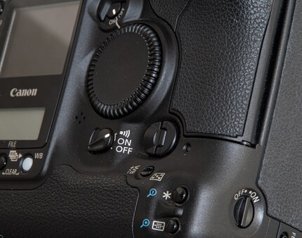 Das ist bei der EOS-1-Reihe bis heute so ähnlich. Ich gebe zu, dass ich mit dem Bedienkonzept dieser Reihe nicht so vertraut bin. Mich verwirrt daher auch, dass es über dem Ein-Aus-Schalter einen weiteren, sehr ähnlich aussehendem On-Off-Schalter gibt, dessen Zweck ich tatsächlich im Manual nachlesen muss. Er schaltet das riesige Daumenrad ein und aus. Oder besser gesagt: Er sperrt es, wenn er auf Off steht. Unten rechts gibt’s einen dritten On-Off-Schalter. Der sperrt die Bedienung von Auslöser und Drehrad im Hochformatgriff.