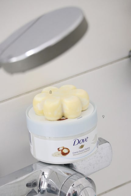 Zum Zeitpunkt der Aufnahme habe ich als Ersatz für die Dove Cream Bar schon mal ein Testprodukt griffbereit in der Dusche platziert. Seither habe ich die Body Bar mehrfach benutzt und muss sagen: Nicht mein Fall. Versprochen werden auf der Verpackung Kokosnüsse. Von denen rieche ich nichts. Dafür nimmt der Karton-ähnliche Geruch überhand. Pluspunkte gibt's für die Form, die liegt nämlich hervorragend in der Hand. Die Kokosnussvariante führen wir aktuell nicht im Shop, dafür «Very Berry».