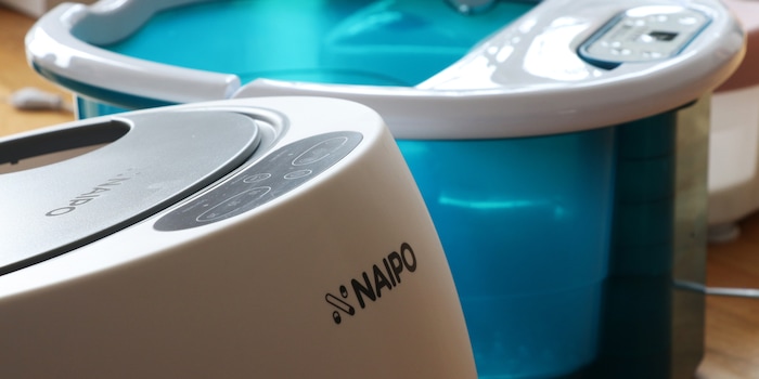 Designbegeisterte werden Naipos Modell vermutlich den beiden anderen vorziehen. Mir persönlich sieht das teuerste Modell unseres Tests etwas zu gewollt fancy aus. Dafür fügt es sich nahtlos in jedes Interieur und besitzt auf der Unterseite eine spezielle Vorrichtung, um die ich das Kabel wickeln kann. Neben der Optik unterscheidet sich dieses Gerät auch in einem anderen Punkt deutlich von den anderen: Es arbeitet mit Dampf statt mit einem Wasserbad. Dazu fülle ich vor dem Gebrauch einen kleinen Kunststoffbehälter mit Wasser und setze ihn in die Trennwand zwischen linkem und rechtem Fuss ein.