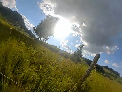 An der nötigen Präzision beim Fliegen und den Tricks mangelt es mir manchmal. Und dann auch wieder nicht. Wenn ich die berühmte «Nadel im Heuhaufen» – in Form eines Holzpfostens – auf dem Feld finde, dann nenne ich das Präzision. Ein zweites Mal würde ich diesen Pfosten bestimmt nicht treffen. Nach dieser sehr unsanften Landung habe ich das Schlimmste befürchtet. Passiert ist nichts – bis auf eine Delle am Akku. Ich bin erstaunt, was die Drohne alles mitmacht. Meine Stürze waren alles andere als sanft.
