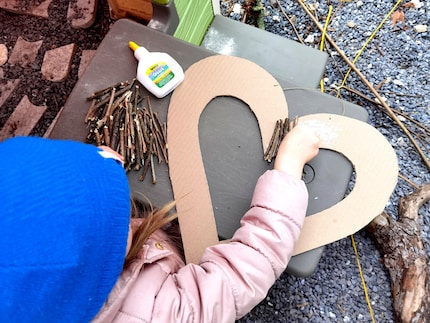 Schritt 3: Das ist der Lieblingsteil meiner Kinder. Die Äste müssen in gleich grosse Teile zersägt oder zerbrochen und schliesslich auf das Herz geklebt werden. Lässt du deine Kinder an die Säge, musst du ihnen dabei auf jeden Fall zuschauen. Weise sie zudem darauf hin, dass sie das Holz mindestens eine Handbreite vom Sägeblatt entfernt halten sollen.