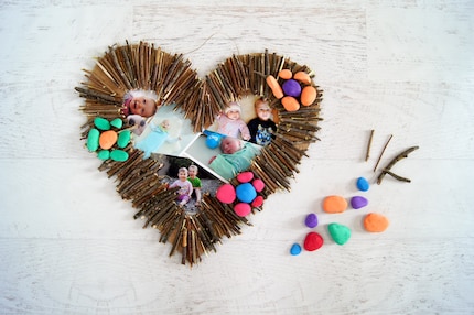Bonus-Schritt: Wenn du das Herz noch eine Spur persönlicher gestalten möchtest, kannst du es mit Fotos hinterlegen. Diese klebst du in Form einer Collage von hinten an den Karton.