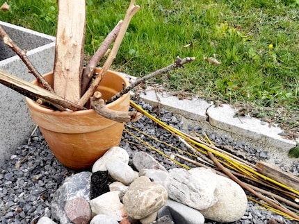 Alle anzeigenVor dem Haus habe ich einen speziellen Bereich, den ich «Kinderbaustelle» nenne. Hier werden Naturmaterialien deponiert, die meine Kinder von ihren Erlebnistouren heimbringen. Sie nutzen diesen Platz oft, um darauf zu bauen oder Bastelideen wie die Meerestiere oder die Glückskäfer umzusetzen. Auf der «Kinderbaustelle» bringe ich meinen Kindern bei, was sie beim Werken beachten müssen. Zum Beispiel, dass sie keine zu schweren Steine heben dürfen oder wie sie mit den Werkzeugen richtig umzugehen haben.