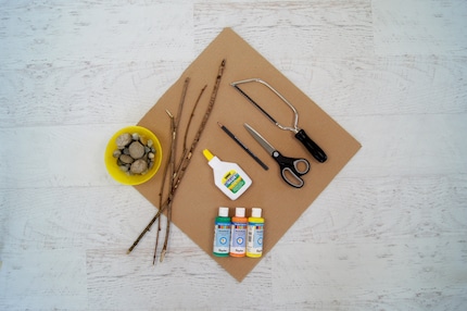 Das Grundgerüst des Herzens besteht aus einem alten Karton. Für die Verzierung habe ich verschiedene Naturmaterialien wie Äste und Steine verwendet. Als Werkzeuge solltest du eine Säge, Schere, Bleistift, Leim und Bastelfarben zu Hause haben. Falls du das Herz wie ich aufhängen willst, brauchst du zusätzlich eine Schnur und eine Nadel.