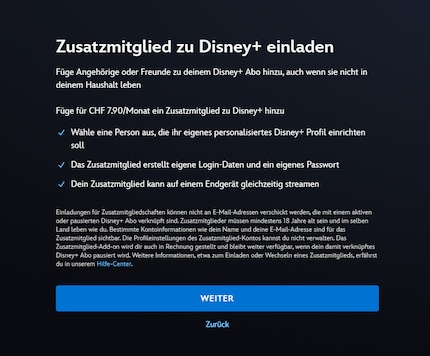 Grundsätzlich bleibt es bei der Devise: ein Account pro Haushalt. Allerdings kannst du deinem Disney+-Abonnement nun ein sogenanntes «Zusatzmitglied» hinzufügen.