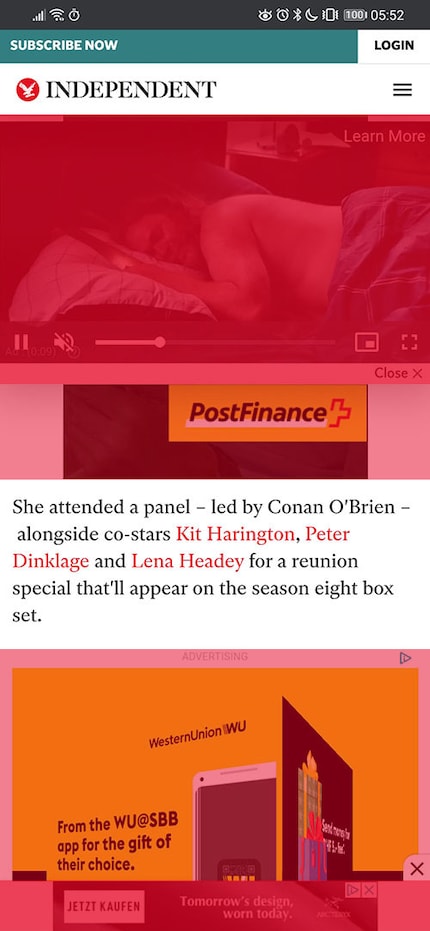 Frechheit. Wie viel vom Screen ist Information und wie viel ist Werbung? Mich interessiert doch der neueste Schmodder der Schweizer Post nicht, wenn ich über die wohl beste Killerin Winterfells lesen will. Mich juckt es doch nicht, was ein recht unelegant aussehender Typ macht, wenn er in einem Video schläft, das sich automatisch abspielt. Und ich brauche Western Union nur dann, wenn ich einem nigerianischen Prinzen zehntausend Stutz schicken muss, damit er mir eine Million rückvergütet, weil sein Land gerade in der Krise steckt. Glücklicherweise hat er mich privat gefunden und mir eine nette Mail geschrieben. Ferner interessiert es mich schon gar nicht, was die Sportmarke Arc'teryx wieder verbrochen hat. Zu teuer.