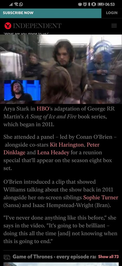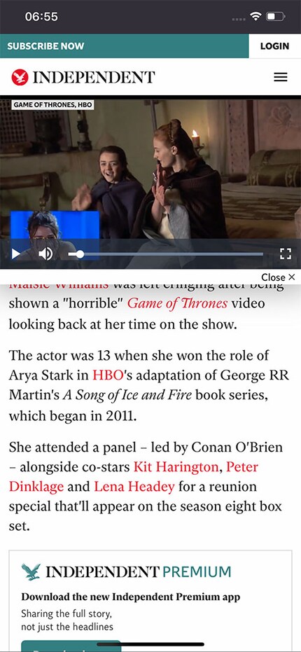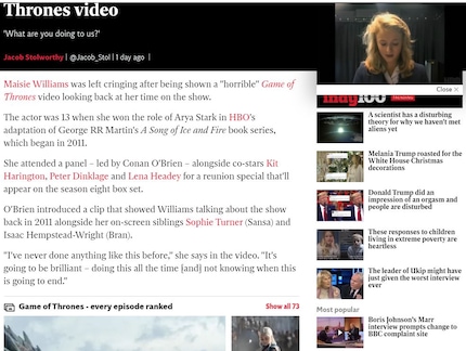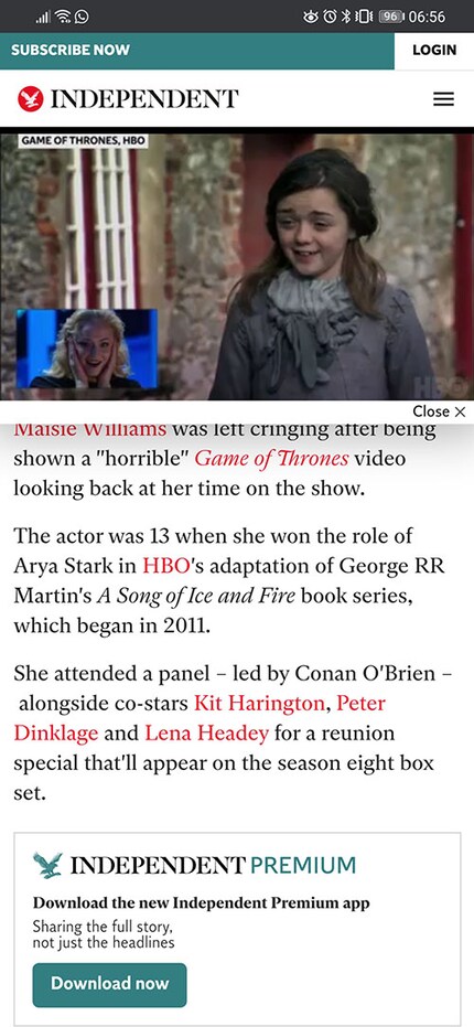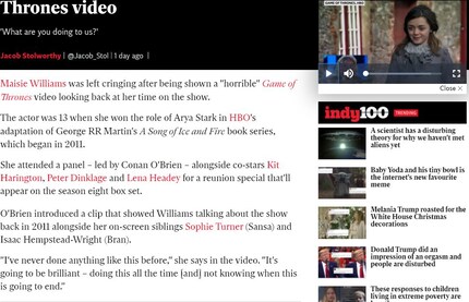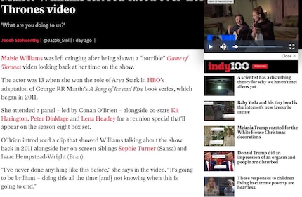 Alle anzeigenAngefangen hat es ganz banal. Mein Newsfeed zeigt mir eine News an, wie er es halt so tut. Es geht um Schauspielerin Maisie Williams, die in einem lustigen Panel auf ihre Zeit als Arya Stark in der Hit-Serie «Game of Thrones» zurückblickt. Publiziert wurde der Artikel in der Englischen Online-Zeitung The Independent.