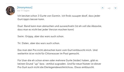Ein weiterer Nachteil: Das Modul und der Gurt sind fix miteinander verbaut. Anders als beispielsweise bei Polar lässt sich das Modul nicht vom Gurt trennen. Das wäre aber die Lösung des Dilemmas. Ein Modul, das alles kann und dazu diverse Gurte für unterschiedliche Anwendungen, wie zum Beispiel das Schwimmen im Freiwasser oder indoor im Chlorwasser.