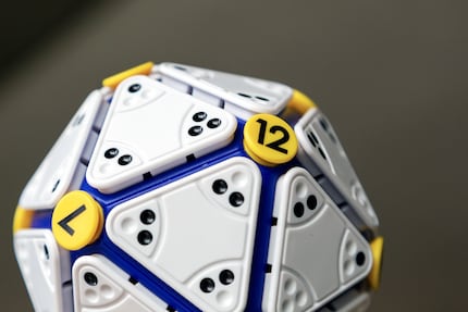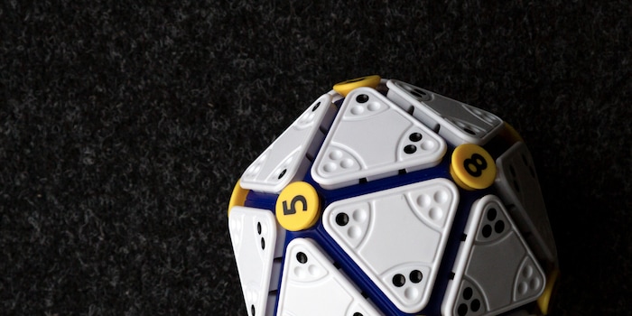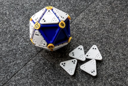 Icosoku ist ein Sudoku in Würfelform. Genauer gesagt, einem Ikosaeder. Das ist einer der fünf platonischen Körper und besteht aus 20 gleichseitigen Dreiecken und 12 Ecken. Auf die Ecken kannst du nach Belieben gelbe Zahlen von 1 bis 12 stecken. Danach hast du verschiedene Dreiecksplättchen mit unterschiedlichen Punkten zur Verfügung. Mit diesen Punkten musst du die Eckzahl passend hinlegen. Steht auf der gelben Ecke zum Beispiel eine 6, musst du mit den fünf umliegenden Dreiecken 6 Punkte ansetzen. Zu Beginn ist dies noch einfach, doch je mehr Plättchen du gelegt hast, desto kniffliger wird die Suche nach einem passenden Dreieck.