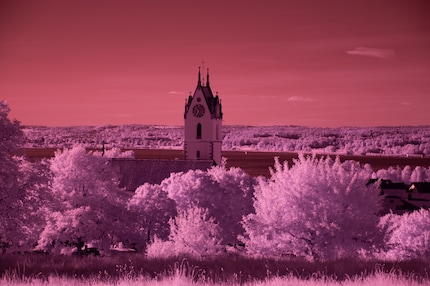 Pflanzen mit grünen Blättern sind das Motiv schlechthin bei der Infrarotfotografie. Gerne natürlich in Kombination mit anderem, aber zumindest ein bisschen Grünzeug gehört immer dazu. Vor dem meist sehr dunklen Himmel erscheinen die hellen Blätter besonders eindrücklich. Voraussetzung dafür ist, dass der Himmel nicht bedeckt ist. Kleine Schönwetterwolken dagegen sind okay, sie machen das Bild sogar interessanter.