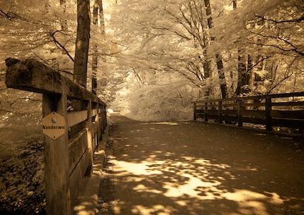 Dass ich ohne Stativ fotografieren kann, hat noch einen anderen Grund. Die Kamera kann trotz IR-Filter ein brauchbares Live-Sucherbild anzeigen. Im Sucher der Spiegelreflexkamera sehe ich nichts, weil der IR-Filter das gesamte für mich sichtbare Farbspektrum blockiert. Der Bildschirm dagegen zeigt das Bild, wie es der Sensor sieht, und anscheinend bekommt der genug Infrarotlicht, um ein gut sichtbares Bild darzustellen. Sogar der Autofokus funktioniert.