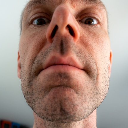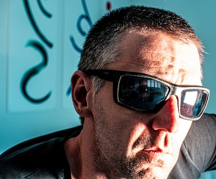 Ich halte mir für dieses Bild den sehr hellen und heissen 400-Watt-Halogenstrahler vor das Gesicht, um ein spezielles Licht zu erzeugen. Ohne Sonnenbrille geht das nicht. Um die Wirkung des harten Lichts zu verstärken, habe ich tatsächlich in Lightroom die Klarheit voll aufgedreht. Den Regler «Struktur» ebenfalls. Die Farben stammen nicht vom Weissabgleich, sondern von der Kalibrierung à la Orange & Teal. Dass die Sonnenbrille in der vollen Auflösung Details meiner Wohnung offen legt, daran habe ich nicht gedacht. Also aufgepasst: Veröffentlichst du Selfies mit Sonnenbrille, schau genau hin und reduziere gegebenenfalls die Auflösung!