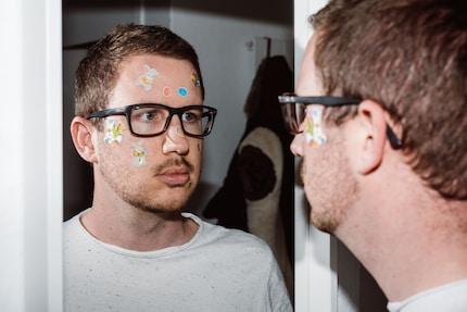 Tom bestätigt das: «Gleiches Kamera- und Blitzsetup wie beim ersten Bild. Nun habe ich mich aber seitlich über die Schulter in einen Spiegel fotografiert. Die Kleber sollen vermitteln, dass man sich selber nicht immer allzu ernst nehmen sollte.»