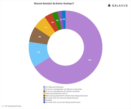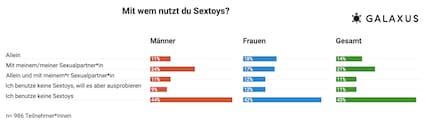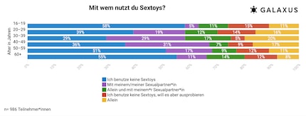 Konkret nutzen 14 Prozent der Deutschen ihr Sexspielzeug allein, 21 Prozent mit einem oder mehreren Partner*innen und 11 Prozent sowohl allein als auch mit anderen. Weitere 11 Prozent nutzen zwar noch kein Sexspielzeug, sind aber neugierig. Und knapp über 40 Prozent sind gar nicht an Sextoys interessiert.
