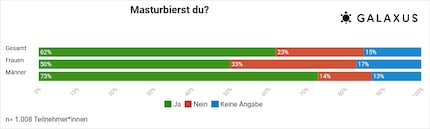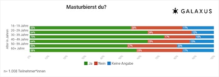 Aus der Umfrage geht weiter hervor, dass fast drei Viertel der Deutschen masturbieren (62 Prozent), wobei auch hier die 30- bis 39-Jährigen am fleißigsten sind (73 Prozent). Männer masturbieren mit 73 Prozent übrigens deutlich häufiger als Frauen. Bei Letzteren sind es bloß sechs von zehn.