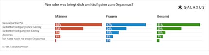 Frauen kommen dagegen deutlich häufiger mit einem Sextoy zum Orgasmus als Männer (15 Prozent Frauen vs. 5 Prozent Männer), während Männer öfter mal ohne Spielzeug oder Partner*in kommen (33 Prozent Männer vs. 24 Prozent Frauen). Mit Abstand am häufigsten erreichen die Deutschen aber gemeinsam den Höhepunkt (51 Prozent). Das trifft insbesondere mit steigendem Alter zu. Fünf von hundert Frauen hatten indes gar noch nie einen Orgasmus.