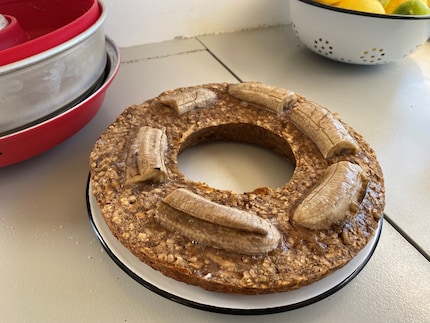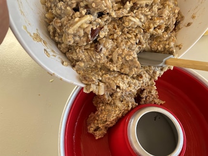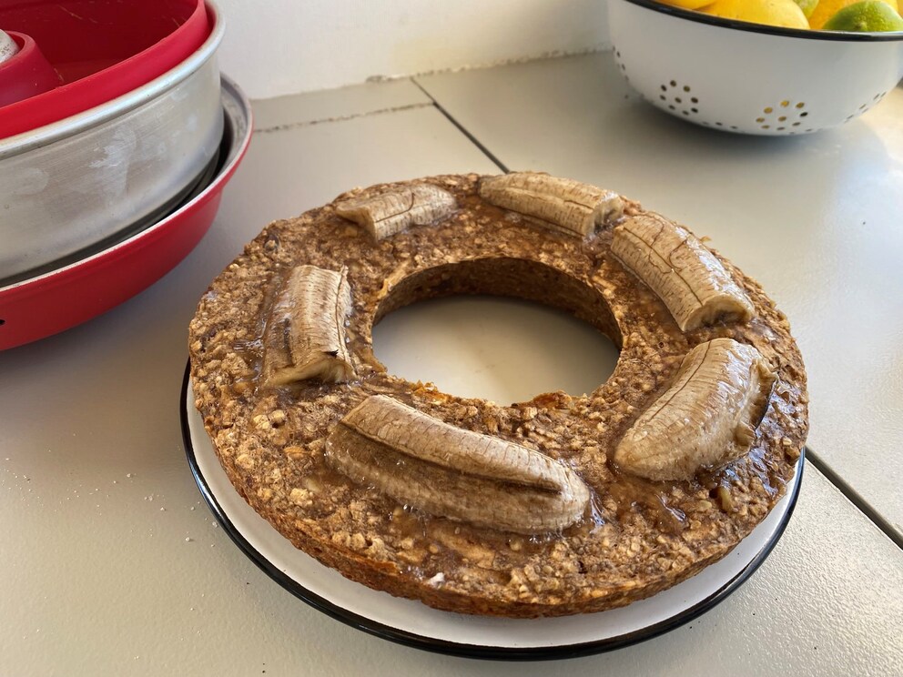 Drei der Bananen mit der Gabel zerdrücken. Den Apfel in möglichst kleine Stückchen schneiden. Wer eine Reibe an Bord hat, kann diese nutzen. Die Chia-Samen mit einem guten Schuss Wasser für 10 Minuten quellen lassen, währenddessen alle trockenen Zutaten vermengen und diese dann mit den restlichen Zutaten vermischen. Jetzt die Datteln klein schneiden und ebenfalls in den Teig mischen. Schließlich den Teig in die mit Kokosöl gefettete Form geben. Die letzte Banane längs halbieren und auf den Teil legen. Der Omnia-Ofen sollte einmal kurz bei voller Hitze auf Temperatur gebracht werden, dann kann man die Leistung des Gasherds auf die Hälfte reduzieren. Der Omnia-Ofen sollte nun etwa 50 bis 60 Minuten auf dem Herd stehen. Achtung: Nicht zu früh den Deckel heben, sonst entweicht die Hitze und die Backzeit verlängert sich. Nach dem Backen ist der Kuchen noch etwas weich, aber nach ein oder zwei Stunden, besser noch am nächsten Tag, ist die Konsistenz perfekt.