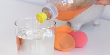 Schritt 1: Schnapp dir ein mikrowellentaugliches Gefäss – ein Trinkglas, eine Schale oder ein Tupper – und fülle es mit Wasser. Gib ein paar Tropfen Spülmittel hinzu. Gut mischen. Dann drückst du deinen Schwamm in das Wasser-Spülmittel-Gemisch, bis er sich vollsaugt und nicht mehr an der Oberfläche schwimmt.