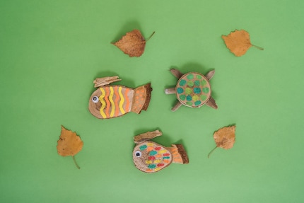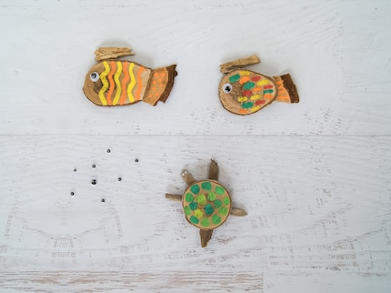 1. Klebe die verschiedenen Naturmaterialien zu Meerestieren zusammen. Gerne können natürlich auch andere Motive gewählt werden – je nach Interesse deines Kindes.