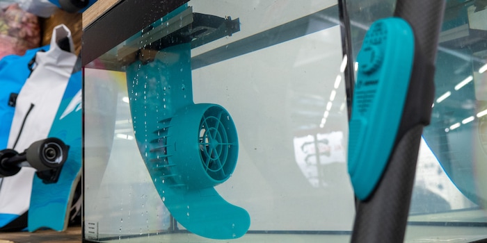 Alle anzeigenDie E-Finne funktioniert ganz ähnlich wie ein E-Bike und liefert immer dann zusätzlichen Schub, wenn du beim Paddeln selbst Kraft aufwendest. Dann surrt ein kleiner Motor und sorgt dafür, dass es schwungvoll vorwärts geht. Von Antriebssystemen fürs SUP habe ich schon häufiger gehört, aber noch keines genutzt oder in Aktion gesehen. Deshalb bleibe ich an der Sportmesse OutDoor by ISPO vor dem kleinen Aquarium stehen, das am Stand der Marke F2 aufgebaut ist, die das von JayKay produzierte Produkt vertreibt. Eine Finne mit Benefits. Soll heissen: sie verfügt über eine kleine Schiffsschraube, falls man das in dieser Grösse schon so bezeichnen darf. Davor ein Paddel mit Controller, Dreh- und Schieberegler. Da ich das Aquarium im ersten Versuch direkt zum Überschwappen bringe, lasse ich mir kurz zeigen, wie das System funktioniert.