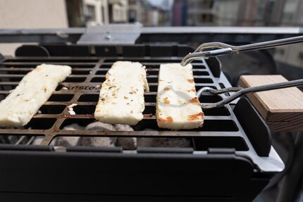 Da ich auf der kleinen Variante grilliere, geht’s zügiger als gewohnt, bis die Briketts glühen. Nach knapp 30 Minuten kann ich meinen vorbereiteten Halloumi aufwerfen. Den Rost habe ich vorher übrigens kurz mit Spülmittel abgewaschen, damit alles sauber ist für den ersten Einsatz. So einfach funktioniert die Reinigung dann auch jedes weitere Mal nach Gebrauch. Der Halloumi brutzelt und klebt nur ein wenig am Rost. Da hat’s mir den Käse sicher schon übler verrissen. Nach wenigen Minuten prangt ein goldbraunes Grillmuster auf den Stücken. Bereit zum Verzehr. Schmeckt.