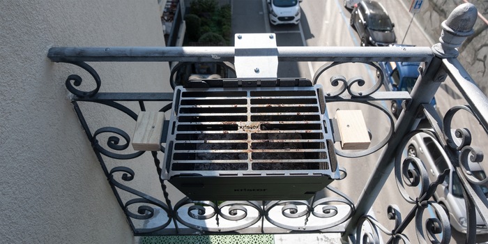 Bei der Verpackung verzichtet Knister komplett auf Plastik. Der Grill wird in einer Kartonschachtel, die mit Kartonschnipseln ausstaffiert ist, geliefert. Genauso sind auch die drei Einzelteile der Balkonhalterung verpackt. Dazu gibt’s ein paar wenige Schrauben, die ganz bescheiden in einem Couvert stecken. Trotz der wenigen Bauteile bin ich mit der Halterung etwas überfordert. Per Whatsapp schreibe ich den Knister-Support an und bekomme visuelle Hilfestellung. Lag wohl doch an mir, denn auf einmal funktioniert die Befestigung an meinem Balkongeländer.