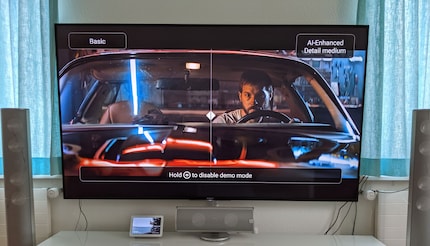 Und schliesslich ist da noch Nvidias neue AI-Upscaling-Technik. Damit werden Nicht-UHD-Inhalte auf Wunsch auf UHD hochgerechnet. Du kannst wählen, wie stark das Upscaling sein soll. Am besten finde ich den Demo-Modus. Ist dieser aktiviert, schaltest du in dem du lange auf die Menütaste drückst, den Bildvergleich-Modus ein. Dann teilt sich das Bild und du siehst links das ohne AI und rechts das verbesserte. Du kannst sogar den Teiler frei nach links oder rechts verschieben. Alternativ schaltest du mit einem Klick auf die Menütaste zwischen den beiden Bildmodi um.