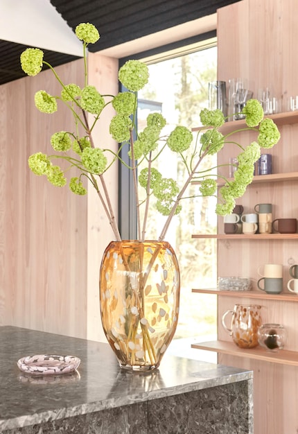 Ein weiterer Vorteil von geflecktem Glas ist, dass es weder langstielige Lilien noch rote Rosen braucht, um Farbtupfer ins Interior zu bringen. Die Vasen-Serie von Butlers macht’s vor. Sie ist von Confetti-Papierschnipseln inspiriert und bringt wie ein Blumenstrauss verschiedene Farben auf einer Fläche zusammen. Aber auch einfarbig hellt jede Vase, etwa im Trendton Very Peri, den Raum mehr auf als eine durchsichtige Glasvase. Daher mein Fazit: Ob monochrome oder kunterbunte Variante – Flecken auf Glasoberflächen sind keine Schandflecken, sondern Schönheitsflecken.