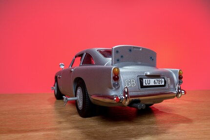 Im Modell von Playmobil sind die bekannten «Features» aus den Filmen enthalten. Du kannst zum Beispiel das Nummernschild wechseln, die Felgen zu drehenden Messern machen, ein schusssicheres Schild aus dem Kofferraum ausfahren oder den Beifahrer mit einem Schleudersitz aus dem Fahrzeug katapultieren.
