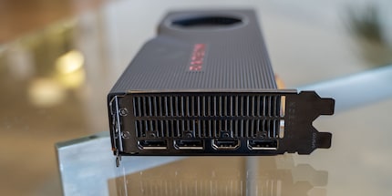 Der 8 GB grosse GDDR6-Videospeicher taktet mit effektiven 14 GHz und kommt durch das 256 Bit breite Speicherinterface auf eine Bandbreite von 448 GByte pro Sekunde. Die Leistungsaufnahme, bei AMD als «Total Board Power» ausgewiesen, beträgt 225 Watt. Am Netzteil angeschlossen wird die Karte mit einem 8 Pin und einem 6 Pin Kabel. Als Schnittstelle fungiert PCI-Express 4.0 x16. Als Ausgänge stehen ein Mal HDMI und drei Mal Display Port zur Verfügung.