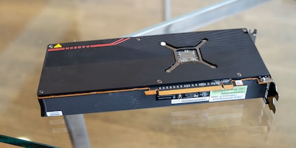 Vom Design her ist die Karte schlicht gehalten. Das PCB wird von einer dunkelgrauen Backplate bedeckt. Diese und das Lüftergehäuse bestehen aus einer Aluminium-Legierung. Das Gehäuse ist gerillt und an einer Stelle etwas eingedrückt. Es sieht so aus, als ob die Karte angefahren worden wäre. Gemäss AMD soll diese Form für besseren Luftstrom und weniger Lärm sorgen.
