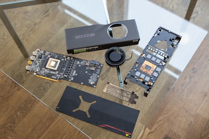 Die Umgebungsluft wird vom 70-mm-Radiallüfter angesogen und durch die Finnen eines Aluminiumblocks im oberen Bereich des Lüftergehäuses gedrückt. Die dadurch erhitzte Luft wird auf der Rückseite der Karte ausgeblasen – bei eingebauter Karte also aus dem PC. Im Gegensatz zu Axiallüftern sorgt das für mehr Lärm, weniger Airflow und höhere GPU-Temperaturen. Die Karte ist 27.2 Zentimeter lang, 11.1 Zentimeter breit und 3.6 Zentimeter hoch.