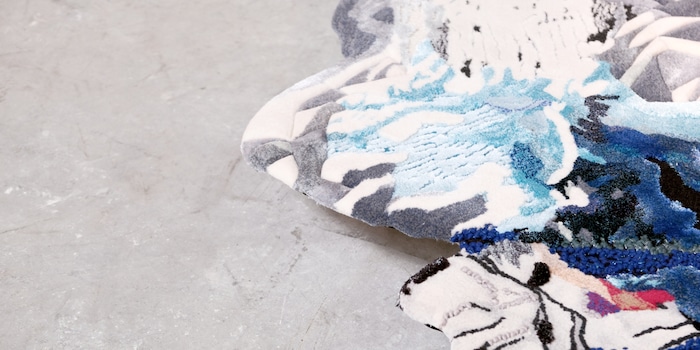 Erika Schillebeeckx und Justine de Moriamé von Krjst Studio malen, indem sie weben. Der handgetuftete Teppich «Skrimsli» gleicht von Weitem einem Ölgemälde, auf dem ein Ozean zu sehen ist. Wegen seiner Blaunuancen, aber auch wegen seiner wellenartigen Formen. Als ich die Designerinnen auf die Ähnlichkeit anspreche, erklären sie mir, dass ihr Einzelstück tatsächlich von der Natur inspiriert ist. «Dieser Teppich soll wie jedes unserer Werke Farben zum Ausdruck bringen, die Worte nicht beschreiben können.»