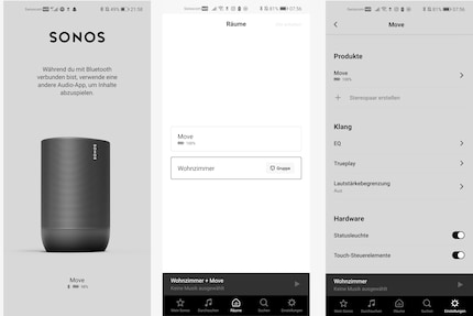Einmal gekoppelt, verbindet sich der Move, sobald du die Taste an der Rückseite der Box drückst, gleich mit deinem Phone. Wenn du den Move im Bluetooth-Modus hast, kannst du die Box aber nicht mehr mit der Sonos Controller App steuern.