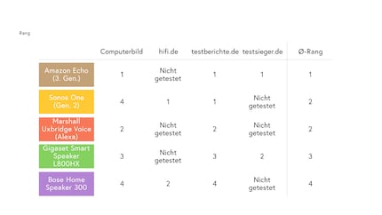 Wir haben die fünf smarten Lautsprecher in den Bestenlisten von vier Magazinen gefunden. Auf diesen Plätzen landen sie, wenn Computerbild, testberichte.de, hifi.de und testsieger.de nur diese fünf Speaker getestet hätten. Interessant ist der durchschnittliche Rang, den die einzelnen Lautsprecher erreichen.