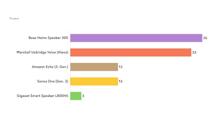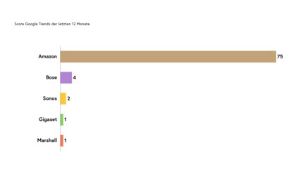 Der Vorsprung für Amazon ist gewaltig. Gegen die geballte Power des Konzerns haben die Konkurrenten keine Chance. Lässt man den Platzhirsch außer acht, ist Bose der bekannteste Player auf dem Markt. Mit wenig Abstand kommen Sonos, Gigaset und Marshall hinterher.