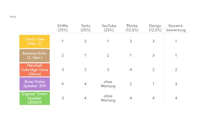 Alle anzeigenKeiner schneidet gut ab. Alle sind insgesamt nur befriedigend. Der Sound fließt mit 40 Prozent in die Gesamtnote ein und ist nicht immer Schuld an den durchschnittlichen Bewertungen. Die Handhabung und der Datenschutz sind für 20 Prozent und 10 Prozent der Gesamtnote verantwortlich. Beim Datenschutz sind alle nur ausreichend, was die Gesamtnoten nach unten zieht. Die Sprachassistenten machen 20 Prozent der Gesamtnote aus und sind mit kleinen Unterschieden alle gut. Der Sonos One setzt sich vor allem wegen seines gut bewerteten Klangs auf den ersten Platz.