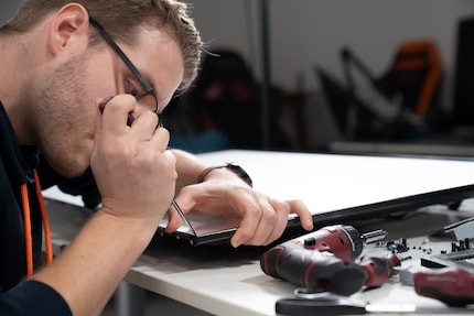 Was ich da aufschraube, ist ein Sony XG9005, ein Full-Array-Local-Dimming-Fernseher – das ist die Hintergrundlicht-Technologie, die fürs beste Bild sorgt. Aber dazu komme ich noch. Zuerst mache ich die Abdeckung Schraube für Schraube ab.
