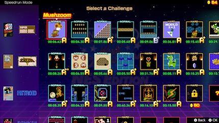 Die Challenge-Pakete sind thematisch sortiert. In einigen geht es darum, in verschiedenen Mario-Games den ersten Pilz zu finden. In anderen wiederum geht es um Zerstörungswut. So müssen wir in einem Paket in «Super Mario Bros.» möglichst schnell eine bestimmte Anzahl an Blöcken zerstören oder in «Zelda II» Bodenplatten kaputt hauen.