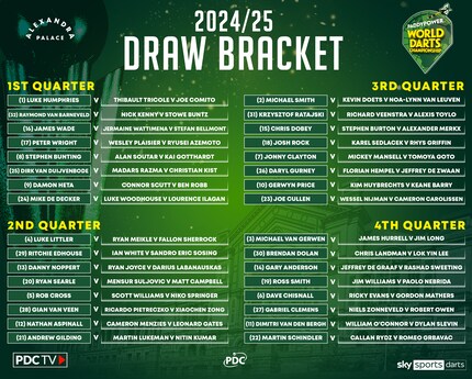 Traditionell startet der amtierende Weltmeister am ersten Abend ins Turnier. Der Gegner von Luke «Cool Hand» Humphries wird zuvor zwischen dem Franzosen Thibault Tricole und dem Australier Joe Comito ausgespielt. Diese Erstrundenbegegnung ist somit auch das Eröffnungsspiel der diesjährigen Weltmeisterschaft.