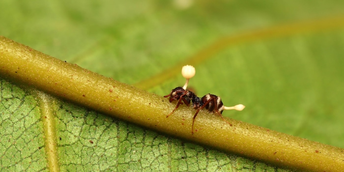 Die Evolution ist schuld, denn die Pilze nutzen die Ameise zur Fortpflanzung und schaffen sich ideale Voraussetzungen dafür. Hat sich die Ameise verbissen, infiltrieren die Pilzhyphen den ganzen Körper, bis schließlich ein Fruchtkörper herauswächst, der die neuen Sporen enthält und den ganzen Zyklus wieder von vorne in Gang setzt. In Thailand – hier wurde Ophiocordyceps unilateralis erforscht – ist der perfide Mechanismus sogar derart ausgereift, dass sich die Ameisen zur Mittagszeit in circa 25 Zentimeter Höhe verbeißen. So hat der Pilz perfekte Bedingungen: Es ist hoch genug, damit die Ameisen zur Monsunzeit nicht von den Wasserströmen weggespült werden und zugleich feucht und warm genug für die weitere Pilzentwicklung.