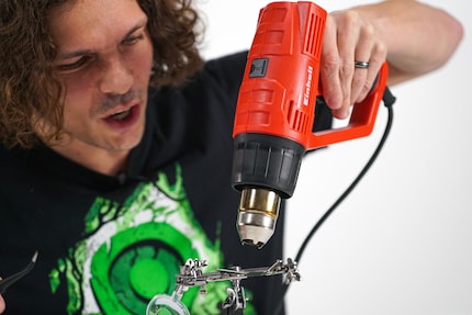 Nachdem das erledigt ist, kann gebastelt werden. Die Switch ist in wenigen Minuten auseinandergeschraubt. Ein bisschen Sorgen mache ich mir, ob ich später noch weiss, welche winzigen Schrauben, wohin gehören. Auch den kleinen Print, an dem der eMMC-Chip befestigt ist, kriege ich mit einem Spatel-Werkzeug leicht weg. Er ist lediglich angeklebt. Als nächstes muss ich den Chip mit dem Heissluftfön erhitzen, bis sich der Zinn zwischen Chip und Print verflüssigt und ich den Chip ablösen kann. Laut Anleitung soll ich eine Temperatur von 396 Grad Celsius und eine Luftgeschwindigkeit von drei einstellen. Mein Heissluftfön hat zwei Stufen und keine Temperaturanzeige. Wird schon schiefgehen. Und das tut es dann auch wenige Minuten später.