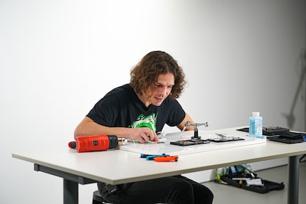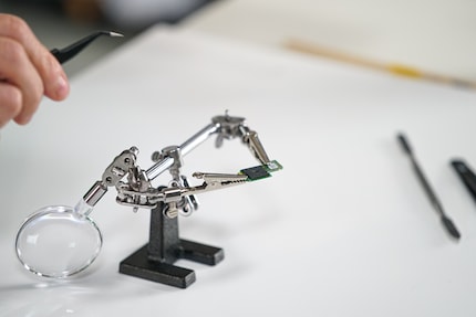 Ausserdem benötige ich Heissluftlötstation, Entlötlitze, Flussmittel, Pinsel, Spannvorrichtung für den Print, sowie diverse Schraubenzieher und Zangen. Für letzteres haben wir in der Redaktion das iFixit-Werkzeug-Set. Eine Heissluftlötstation steht mir nicht zur Verfügung, stattdessen muss ich mich mit der Kombination aus gewöhnlicher Lötstation und einem Heissluftfön zufrieden geben. Letzteres sollte mir zum Verhängnis werden.