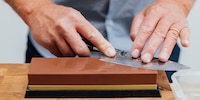 Danach kommt die grobe Seite des Abziehsteins dran. Wie beim Messerschleifen wässere ich den Stein, bevor ich die Klinge erneut im rechten Winkel und mit leichtem Druck drüberziehe. Um gerade zu bleiben, nehme ich ein Stück Holz als Stütze zur Hilfe.